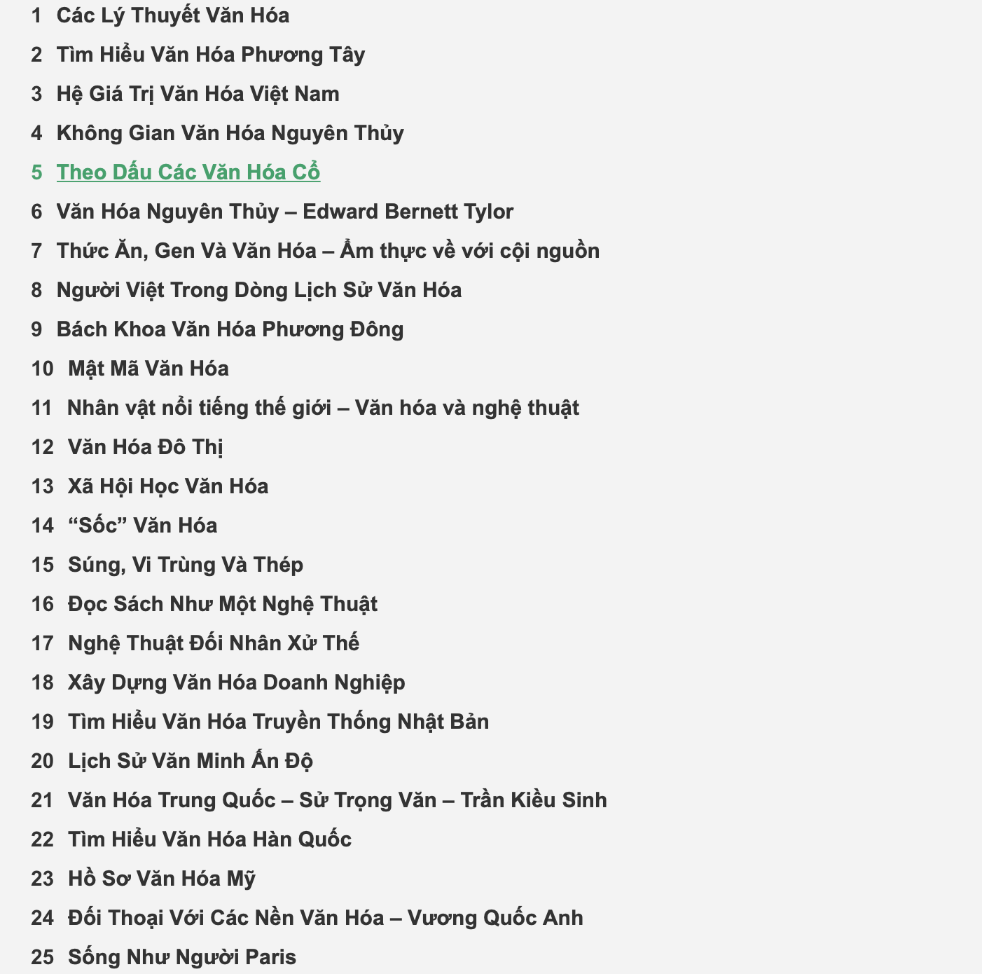25 cuốn sách hay về văn hóa mang đến những khám phá thú vị về đời sống văn hóa của con người qua từng giai đoạn lịch sử được thể hiện qua tôn giáo, tín ngưỡng dân gian, phong tục tập quán, lễ hội, ẩm thực, văn học nghệ thuật, thể thao, du lịch,…